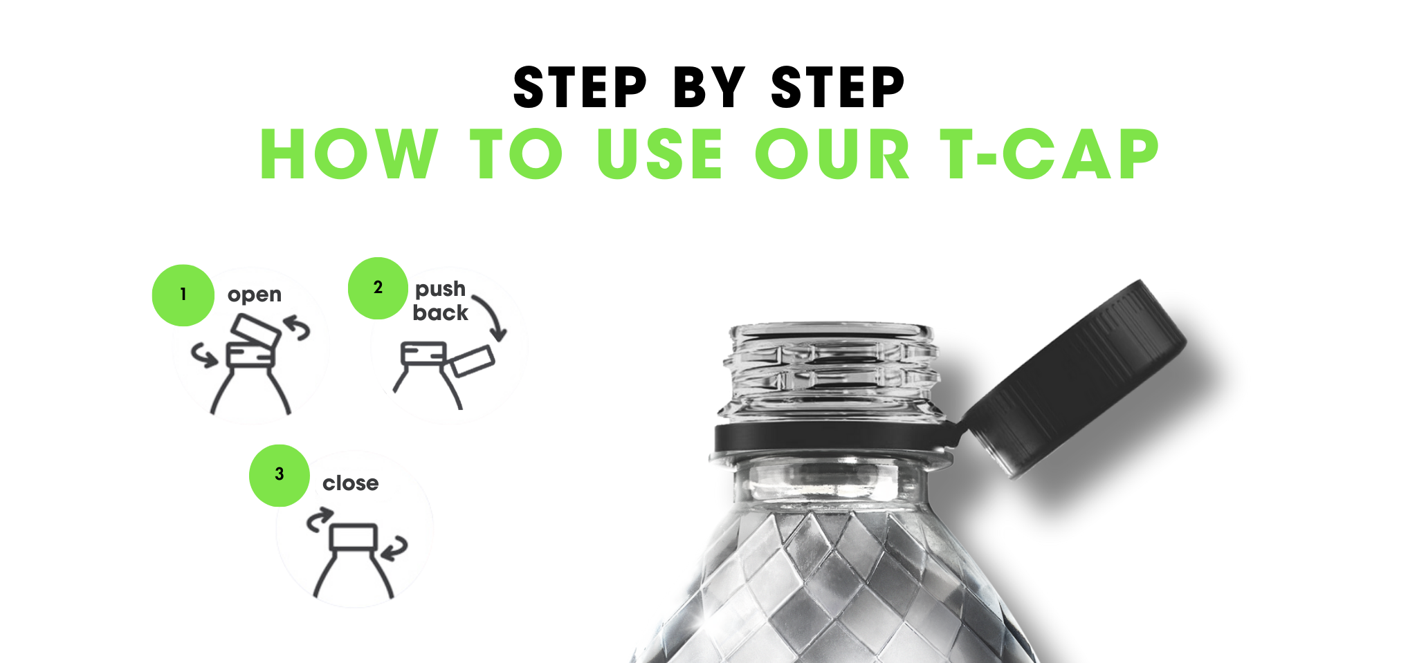 A tethered cap or T-cap is designed to stay attached to the bottle when it’s opened, consumed and recycled. Leaving the cap attached means you don’t have to hold it in your hand, and don’t risk dropping or losing it!